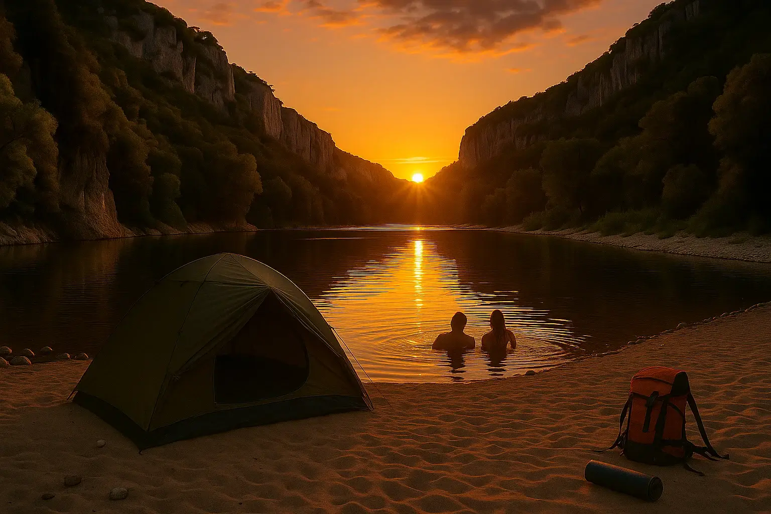 Sur le long du parcours vous trouverez deux aires de bivouac autorisées (nous sommes dans un site protégé, ne l’oublions pas). Il vous faudra au préalable réserver votre nuitée auprès de syndicat des Gorges de l’Ardèche. Vous aurez à choisir entre le bivouac de Gaud, plus en amont, et le bivouac de Gournier, plus en aval. Bien entendu, outre votre protection solaire, l’eau et la nourriture indispensables pour ces deux jours, vous devrez aussi vous munir de votre matériel de couchage ou de camping pour passer une nuit des plus agréables, sous la tente ou à la belle étoile.