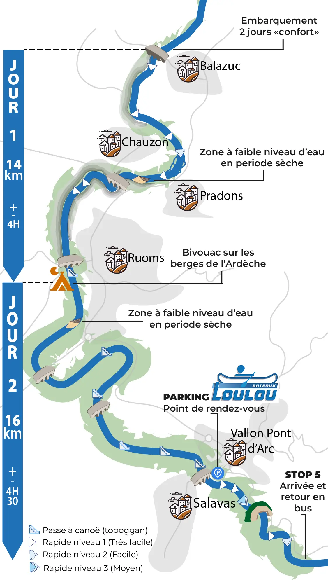 Accessible dès 7 ans (selon conditions physiques), cette formule est parfaite pour ceux qui veulent vivre l’Ardèche en deux jours avec un brin d’aventure et tout le confort nécessaire 🌞.
